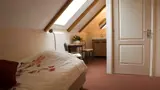The cosy room is a small room on the sunny side of our house. Upon entering the closet right next to the entrance and in front of the bed there is a sitting area. In a niche of the room you find the sink. This room has a box-spring bed and television. The room has bright colours combined with terracotta.